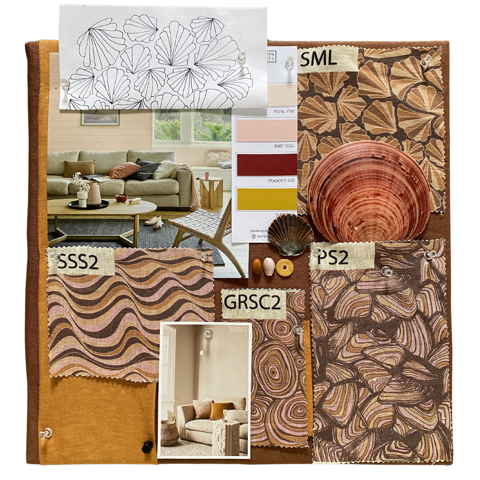 Our 10 year anniversary collection moodboard of the latest collection, in the warm tones of the Claytons colourway, 100% Linen.