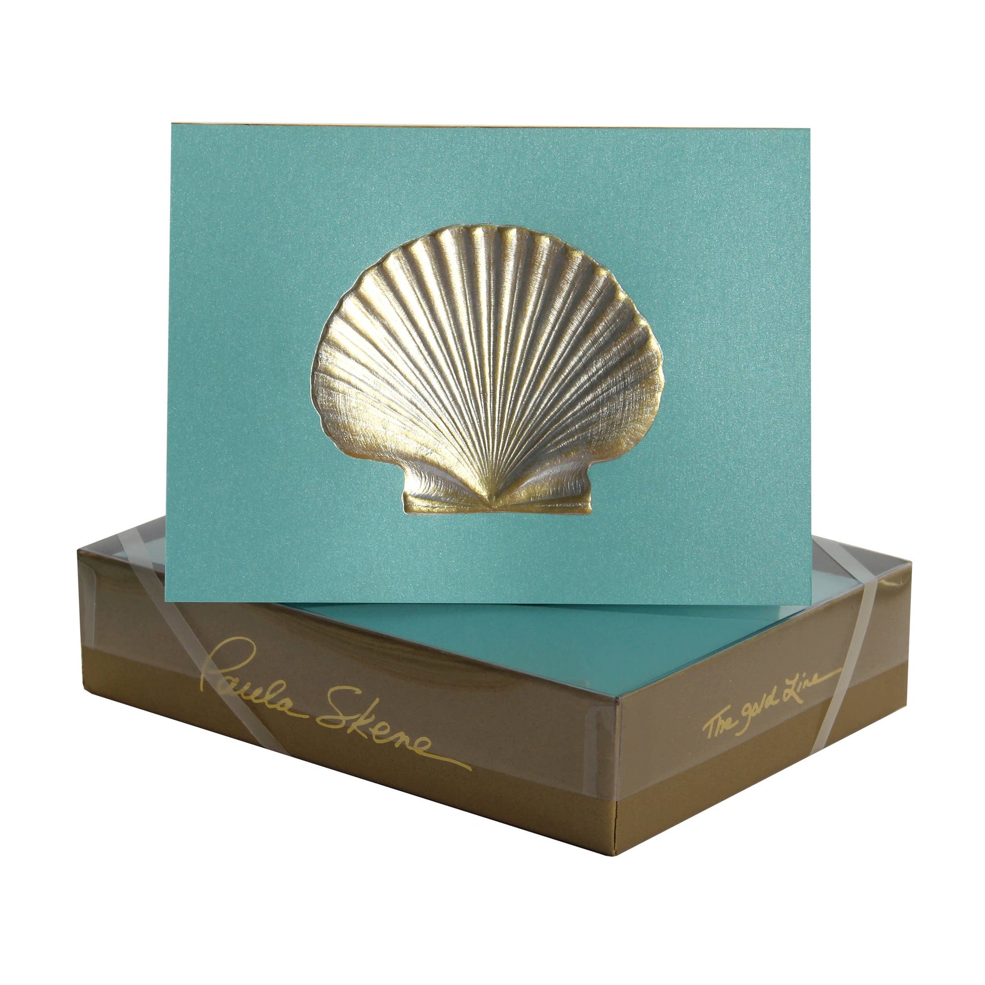 A seaside classic reimagined in shimmering detail — the Scallop Shell on Teal Blank Card features an embossed and foil-stamped scallop shell set against a rich teal background. This elegant design evokes the calm of the coast, making it perfect for thank-yous, notes of encouragement, or simply staying in touch.