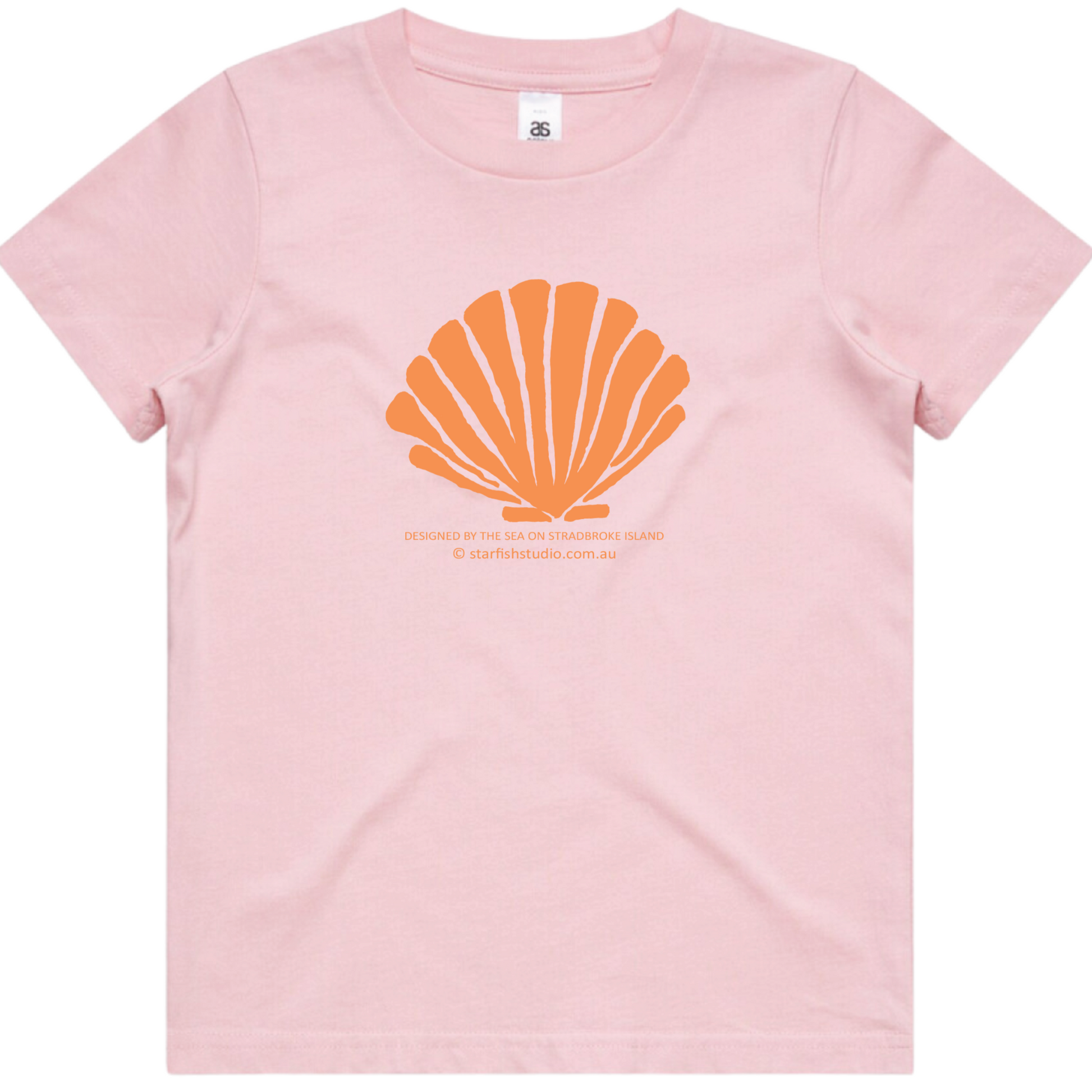 Regular fit T with the Shell image in apricot, screen printed by hand onto the front of the shirt
