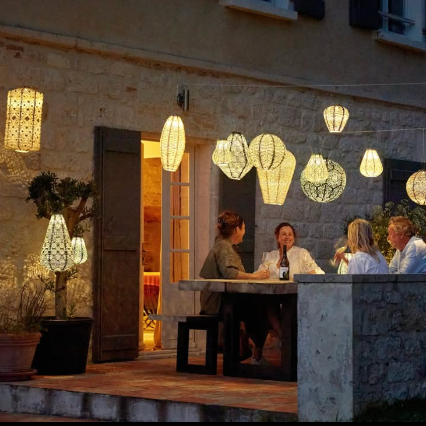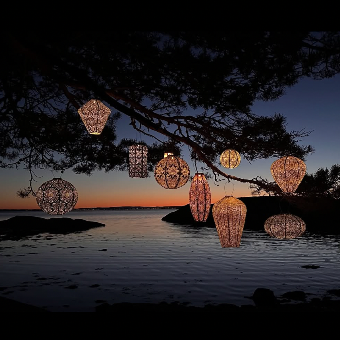 Weatherproof fabric solar lantern. Beautiful patterns with a warm glow.