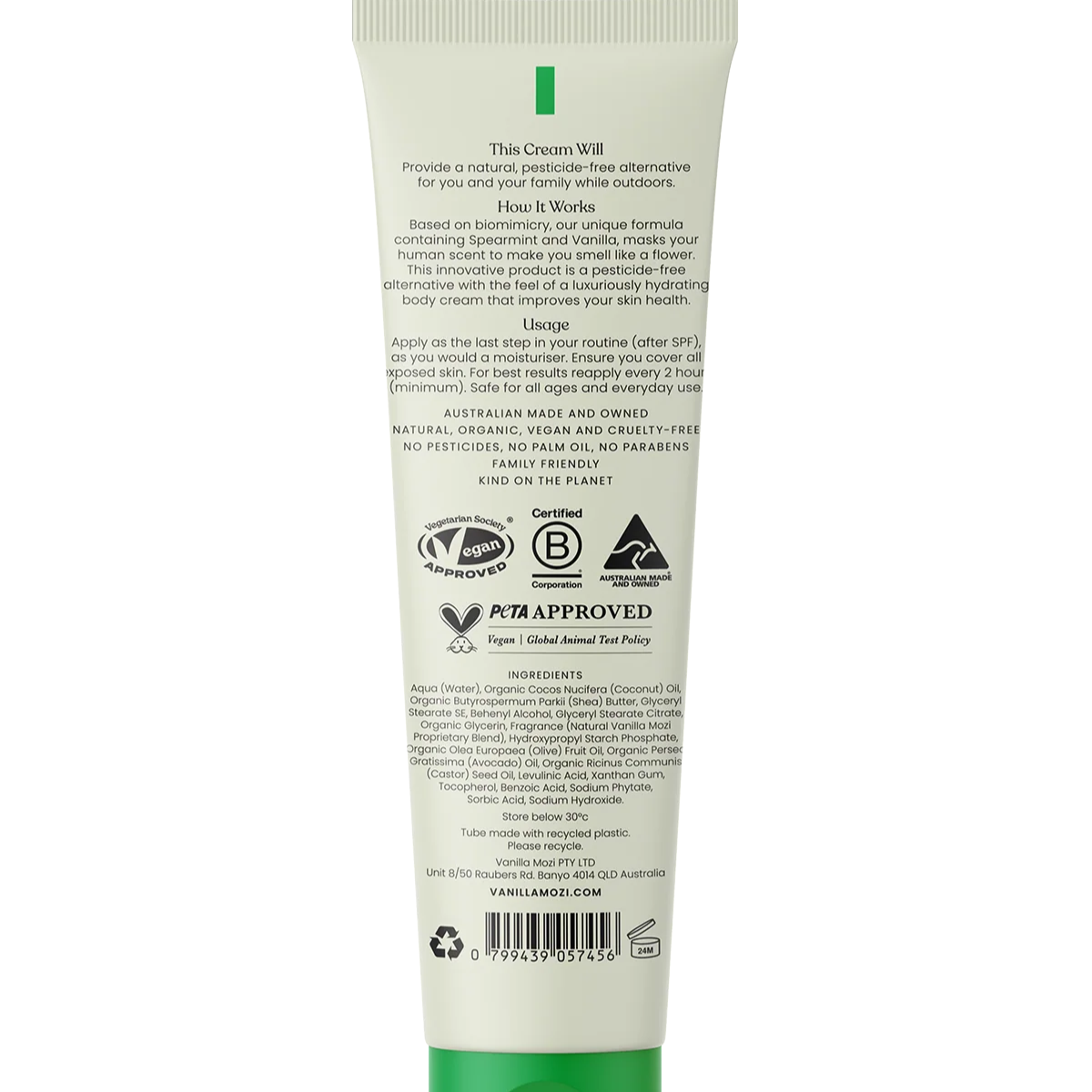 Vanilla Mozi Bite-Proof Body Cream is a beautiful blend of organic and vegan ingredients designed to hide you from biting bugs.